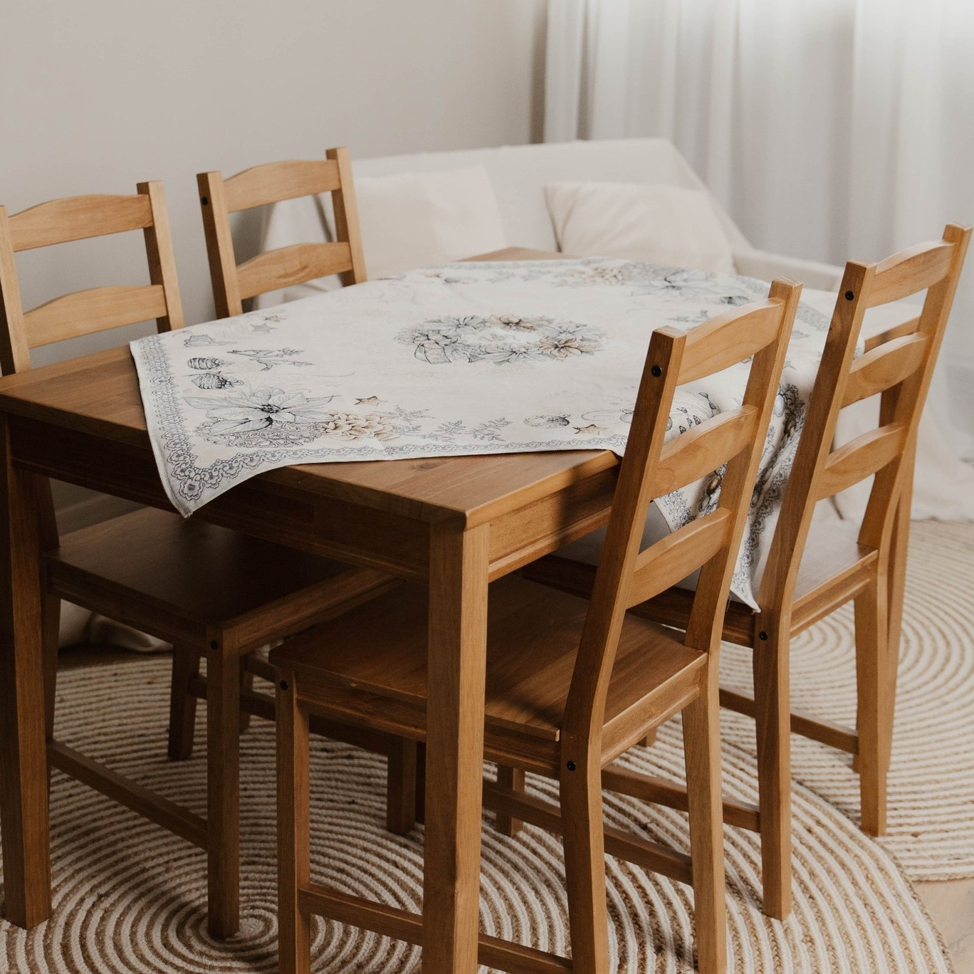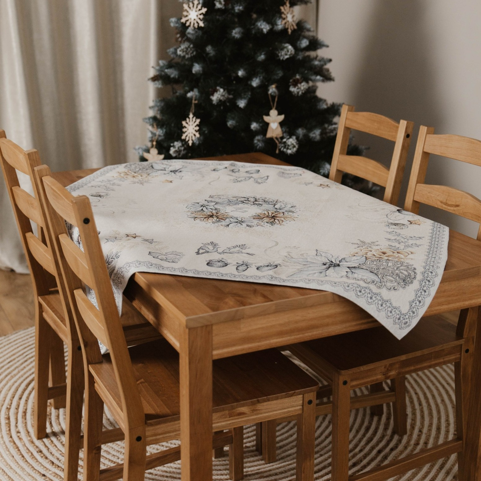 Față de masă de Crăciun din bumbac cu țesătură tip goblen, groasă și rezistentă. Firele ușor strălucitoare îi adaugă un aspect elegant și festiv, perfect pentru masa de sărbători. Materialul dens cade frumos, se așază bine pe masă și este potrivit atât pentru utilizare zilnică în sezon, cât și pentru mese festive.