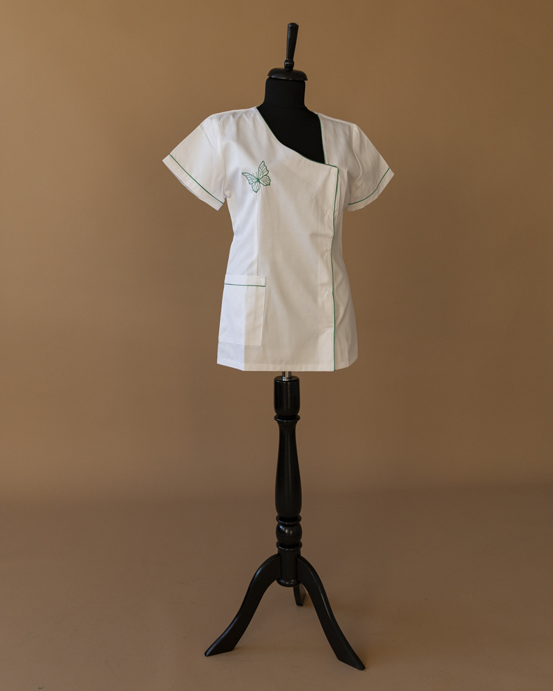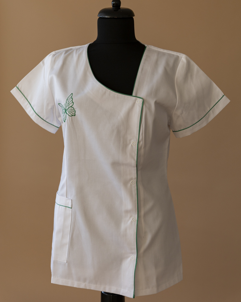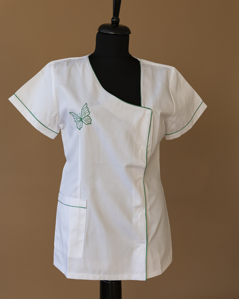 Halatul de damă Bella este confecționat din tercot de calitate superioară, un material plăcut la atingere și ușor de întreținut. Cu un design simplu și elegant, acest halat este ideal pentru medii profesionale și activități zilnice. Închizătura cu capse pe lateral oferă o utilizare rapidă și comodă, iar posibilitatea de a adăuga paspoille adaugă un detaliu suplimentar de eleganță. Croiala fără guler și cu mâneca scurtă îl face perfect pentru perioadele mai calde, menținând un confort optim.